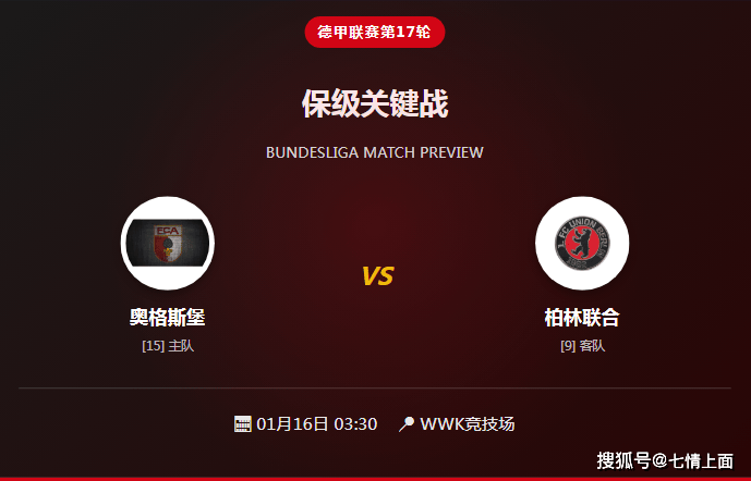 北京时间1月16日03:30,德甲第17轮将迎来一场保级与欧战资格之争的焦点战役。奥格斯堡将坐镇WWK竞技场迎战近期状态不俗的柏林联合。主队深陷降级泥潭急需拿分止颓,而客队则希望延续不败势头冲击更高排名。