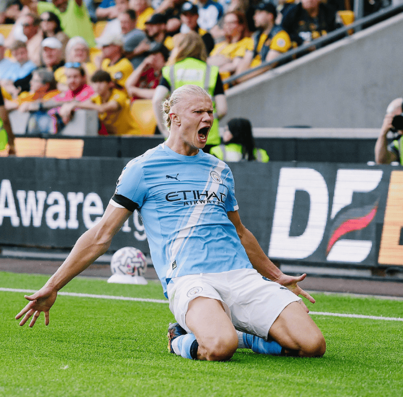 哈兰德双响,超越快乐男孩!新援传射建功,曼城4-0狼队夺开门红