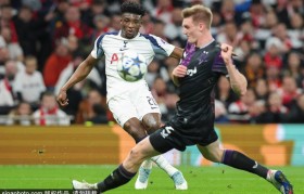 欧冠联赛阶段第6轮:热刺3-0布拉格斯拉维亚 西蒙斯造点破门库杜斯点射